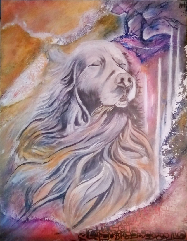Portrait semi-abstrait d’un cocker assis en plein vent, peint en valeurs de gris sur fond aux couleurs pastels. L’accent est mis sur le mouvement du pelage au gré du vent en faisant abstraction de la couleur et de la lumière de la robe du chien.