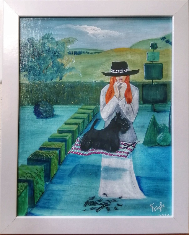 La série des magiciennes comporte 5 toiles de 24x30 cm encadrées en blanc. Chaque femme est une toiletteuse qui a su associer toilettage et art topiaire dans un jardin onirique. Peinture acrylique et vernis satiné.